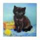 Tile featuring a black kitten in the style of Van Gogh! A fluffy kitten plays with a ball of yarn. Beside him sits a basket with even more yarn. A great gift for cat lovers and Dutch art collectors!