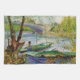 Fishing in the Spring, the Pont de Clichy by Vincent van Gogh is a vintage fine art post impressionism maritime painting featuring a man in a boat fishing in the Seine river in springtime at the Pont de Clichy bridge.