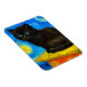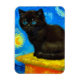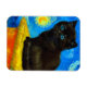 Magnet featuring a Van Gogh cat in the style of Starry Night! A fluffy black kitten perches on a table against a blue night sky and yellow moon. A purr-fect gift for cat lovers and Dutch art collectors!