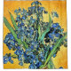 This oil on canvas from 1890, painted by Van Gogh during his stay at the asylum in Saint-Rémy France, shows a vase full of blue and purple iris flowers against a bright yellow background.