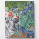 Beautiful and artistic compilation features Vincent Van Gogh's Irises fine art painting as a backdrop to an adorable watercolor leopard with a fancy crown of flowers.
