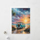 A van is parked on a beach with colourful flowers and trees surrounding it, as dramatic storm clouds part to reveal light breaking through the sky. The scene captures a contrast between the turbulent atmosphere and the peaceful seaside setting.