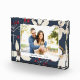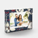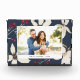 Elegant holiday keepsake photo block features your favourite photo against a navy blue background adorned with pale ivory winter flowers and red berries. Personalize with your custom caption; we love it with your names and the year.