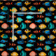 Various colorful tropical fish graphics on black background, seamless repeat pattern