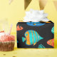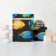 Various colorful tropical fish graphics on black background, seamless repeat pattern