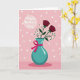 Cette carte représente un bouquet stylisé disposé dans un vase sarcelle élégant qui se trouve dans la moitié inférieure du design, captant une douce lumière comme un regard gentil partagé entre amis ❤️. Un ruban fuchsia vif entoure le col du vase et forme un nœud net, ajoutant une touche de cadeau qui semble affectueuse sans être excessive. Deux grandes fleurs bordeaux profondes s'élèvent au-dessus, leurs pétales arrondis penchés légèrement l'un vers l'autre comme dans un moment calme et attentionné. Des feuilles vert foncé et de minces brindilles avec de petites fleurs blanches complètent l'arrangement, donnant au bouquet un contraste léger et aéré. Le fond est rose pastel avec des cercles blancs doucement estompés dispersés autour, créant un cadre calme et rêveur. En haut à gauche, un cercle blanc contient les mots « Joyeuse fête des mères » en lettrage sombre qui se détache clairement, le texte étant centré à l'intérieur du badge 🌼. Une ombre rose plus profonde se trouve juste sous le vase, l'ancrant sur