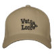 Fits well due to elastic edging, not adjustable. Good qualty material. Good quality embroidering. Subtle lettering (white on beige) just as my wife likes.