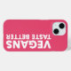 This graphic features bold, pink typography stating “VEGANS TASTE BETTER” prominently. The design employs a modern, eye-catching font that emphasizes the positive message about veganism. The bright colour scheme and strong text create an engaging visual, appealing to those who appreciate or promote plant-based lifestyles. This piece can serve as a slogan for a vegan campaign, restaurant, or awareness initiative