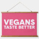 This graphic features bold, pink typography stating “VEGANS TASTE BETTER” prominently. The design employs a modern, eye-catching font that emphasizes the positive message about veganism. The bright colour scheme and strong text create an engaging visual, appealing to those who appreciate or promote plant-based lifestyles. This piece can serve as a slogan for a vegan campaign, restaurant, or awareness initiative