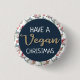 This retro button features the words "Have a Vegan Christmas" in a modern white and a golden calligraphy font, with an elegant blue background and floral wintry border.