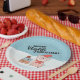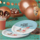 These Vegan Christmas paper plates feature a nice cartoon piglet with a red hat and scarf and some colourful presents, on a snowy background.