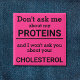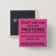 This minimalist fun button, featuring the wording "Don't ask me about my proteins and I won't ask you about your cholesterol" in black lettering on a pink background, is the perfect gift for every vegan.