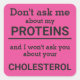 This minimalist fun sticker, featuring the wording "Don't ask me about my proteins and I won't ask you about your cholesterol" in black lettering on a bright pink background, is the perfect gift for every vegan.