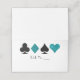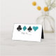 Perfect for a glamourous and glitzy Las Vegas casino wedding, this white folded place card features faux teal glitter with black card suits, a pre-printed space to write in table numbers and a blank white space to write in your guests names. Does your caterer need to know each guest's meal choice? Edit this design to add a coloured backer unique to each meal type or use a sticker to denote who gets what type of meal. These cards are sold in packs of 25 so don't forget to order enough for each place setting!