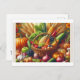A vividly colored still life showcases an abundant harvest with a wicker basket brimming with vegetables and fruits at its center. Surrounding the basket, a variety of produce including pumpkins, corn ears, grapes, and garlic is artfully arranged against a backdrop of golden wheat sheaves and autumn leaves.