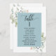 Aidez vos invités à trouver leur table avec cette élégante carte de plan de séjour verdoyante avec les noms des invités. Cadre avec les noms des invités dans le bleu brouillard et délicat détails d'aquarelle de verdure. Cartes recto-verso pour que les clients puissent chercher leur nom à l'avant ou à l'arrière. Libérez de l'espace tout autour en vous donnant la liberté d'utiliser des clips ou un trou de perforation pour accrocher des écrans, ou d'utiliser le support/cadre de table. Détails de calligraphie manuscrite moderne. Verdure dans un beau mélange de tons vert, bleu, beige, beige et terre cuite. Également disponible avec cadre en blanc, en beige tan et en vert. Ayez tous les numéros de table dans la même couleur ou mélangez les couleurs selon le thème de couleur de votre événement. Une partie de notre collection "Elegant Greenery Eucalyptus Mariage and Events" avec une variété de produits de coordination disponibles.