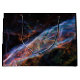 In the Veil Nebula, the ghosts of a colossal stellar explosion linger. Threads of glowing red hydrogen weave through the nebula, energized by the fading shockwave. Pockets of blue oxygen gas and wisps of green nitrogen gas add an eerie beauty to the celestial tapestry. This hauntingly colourful image captures the Veil Nebula's transformation from a massive star to the raw materials for future star systems. - This file is in the public domain in the United States because it was solely created by NASA.