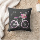 Un élégant oreiller à l'accent fait dans une couleur gris tableau noir, avec des graphiques de la bicyclette blanche et rose d'une fille, avec son panier contenant des fleurs colorées, avec des papillons et des accents tourbillonnant. Le dos de la coussin est recouvert d'un motif rayé gris, blanc et rose. Personnalisez le texte blanc, sur le devant, pour vous-même ou comme une excellente idée cadeau.