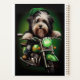 Un ami en fureur derrière les guidons d'une moto verte brillante, portant une tenue verte de la Saint Patrick qui fait tourner la tête. Le chien est habillé d'un ensemble festif, avec une cravate arc-en-ciel verte et un chapeau haut assorti qui se trouve doucement au-dessus de la tête. Le costume présente des motifs complexes de shamrocks et de leprechauns, ce qui indique clairement que ce chien est prêt à célébrer la Saint Patrick avec style.