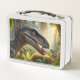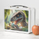 This eye-catching lunch box features a bold design of a velociraptor devouring an egg amidst a dense forest backdrop. Perfect for dinosaur enthusiasts, the detailed artwork brings the prehistoric predator to life, creating a fun and adventurous look. The lunch box's rugged exterior and playful theme make it both a practical and visually exciting choice for kids and adults alike, blending functionality with a unique, creative touch.