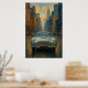A silver Aston Martin DB5 glides through a rain-slicked Manhattan street, its polished curves reflecting the golden haze of a city caught between memory and motion. Towering buildings stretch skyward, culminating in the distant spire of the Chrysler Building—an icon suspended in time. The wet pavement mirrors the architecture and atmosphere, blurring the line between dream and reality. Expressive brushwork and a warm palette of oranges, blues, and greys evoke a sense of cinematic longing, as if the viewer has stumbled into a frame of a forgotten film noir. Velocity Reverie invites reflection on elegance, transience, and the quiet thrill of movement through a world that never stops.