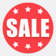 Arrondi, vendre des autocollants avec le texte blanc "Vente" sur un arrière - plan rouge avec des étoiles blanches.