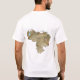 An editable title and slogan accompanies the white stars on a blue band with a yellow band above and red band below of the Venezuelan flag on the front of this t-shirt. The back displays a detailed map of Venezuela.