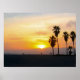This photo shows a beautiful golden yellow, orange, red, and purple sunset over the Pacific Ocean in Venice Beach California. The scene has silhouettes of people walking along the famous boardwalk near the towering palm trees lining the shoreline of sand and sea.