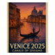 Travel poster design titled "Venice 2025 – Canals of Dreams", featuring a romantic view of the Grand Canal at golden sunset. A gondola with a gondolier in striped shirt gently glides across shimmering water reflecting warm orange and pink hues