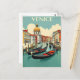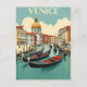 This image is a vintage-style travel poster for Venice. It features a picturesque canal scene with several gondolas floating on the water. The architecture includes colourful buildings and a prominent domed structure in the background. The sky is clear with a few clouds, and the word "VENICE" is prominently displayed at the top.