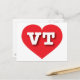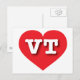 This postcard features a vibrant red heart containing the bold, white, upper case letters VT, the official abbreviation for Vermont, the green mountain state. The reverse side of the postcard is blank, awaiting your handwritten sentiments or customized text.