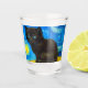 Verre de tir avec un chat Van Gogh dans le style de la nuit étoilée! Un chaton noir moelleux perche sur une table contre un ciel bleu nuit et une lune jaune. Un cadeau à la purr pour les amoureux de les chats et collectionneurs d'art hollandais !