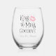 Célébrez la future mariée lors de sa fête de douche de nuptiale, de sa soirée de filles ou de sa fête de fiançailles avec un cadeau de verre à vin sans pied avec la phrase drôle KISS THE MISS GOODBYE (embrassez la demoiselle d'honneur au revoir) accentuée de lèvres brillantes à paillettes roses et une typographie calligraphique élégante dans les couleurs de votre choix et personnalisée avec son nom ou un autre texte personnalisé. ASSISTANCE : Pour obtenir de l'aide concernant la modification de la conception ou la personnalisation, le changement de couleur, le transfert du design sur un autre produit ou si vous souhaitez des articles coordonnés, contactez le concepteur AVANT DE COMMANDER via l'onglet MESSAGE de discussion Zazzle ou envoyez un e-mail à makeitaboutyoustore@gmail.com.