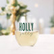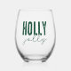 A festive and fun stemless wine glass featuring the phrase "Holly Jolly" in classic green, perfect for Christmas parties and holiday cheer!