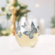 Des motifs inspirés de mosaïques et de dessins juifs traditionnels ornent les ailes, le corps et les antennes de ce papillon monarque. "Paix" écrite en alphabet araméen est assise dans les taches sur les ailes. Cette verrerie est également disponible dans les styles canettes de verre et de roche.