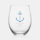 Celebrate your special occasion with this elegant, nautical-themed stemless wine glass, perfect for a coastal wedding, anniversary, or special event. The design features a classic anchor and rope motif, beautifully customized with initials (C&E), names (Cameron & Emily Smith), and a significant date (01.01.20XX), allowing you to create a unique and meaningful keepsake for you and your guests.
