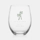 Ces élégantes verres à vin minimalistes et sans tige font de grands cadeaux de fête de mariage ou des faveurs de mariage de destination. Nettoyer la conception minimale comprend vos n noms, date mariage et emplacement dans les lettres serif noires classiques. Un duo de palmiers tropicaux en vert complète le design.