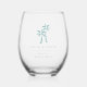 Ces élégantes verres à vin minimalistes et sans tige font de grands cadeaux de fête de mariage ou des faveurs de mariage de destination. Nettoyer la conception minimale comprend vos n noms, date mariage et emplacement dans les lettres serif noires classiques. Un duo de palmiers tropicaux en bleu turquoise turquoise vient compléter le design.