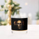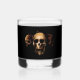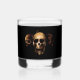 Trois crânes humains sur fond de noir, Une petite créature regarde au-dessus du crâne moyen