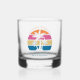 De belles lunettes de whisky de mariage sur mesure avec un coucher de soleil tropical pour une réception sur l'île. Verre à vin personnalisé mignon avec joli rose et bleu derrière de mignons palmiers pour une mariée côtière et un cadeau de conservation de marié pour la fête de mariée et les invités.