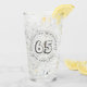 Verre commémoratif d'anniversaire avec le nom de la personne et la date de son anniversaire. Un verre pour quelqu'un qui a 65 ans. Style de numéro hiérarchique.