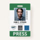 ID presse verticale avec détails verts que vous pouvez personnaliser avec trois logos et une photo. Appuyez sur le badge d'identification en blanc et vert avec la place pour trois logos.