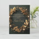 Ce magnifique faire-part de mariage de Noël est orné de verdure et de feuilles de vacances avec des feuilles en faux or et des baies sèches rouges, et d'un cadre en or central sur un arrière - plan noir moderne.