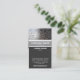 A business card template with an attractive vertical banded design in shades of grey and white with a decorative image texture area at the top. Company name and business type on the main band with Name, title and other address and contact details below, The reverse side of the card has been left blank with a mid grey flat colour. This can be left blank or further customized.
