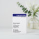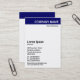 A vertical business card template with a dark blue header. All details on the front with the back left blank, which can be left as is or further customized. The design also allows plenty of space for the addition of other elements e.g. a logo.