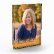 This graduation photo block features a vertical photo frame that fills the entire block. A orange gradient, across the bottom, is accented with white hand written style text that reads: Class of 2018. Custom text allows you to add the name of the graduated and their school.