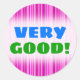 This sticker design features a pattern of thin stripes coloured various shades of colours like magenta and pink. It also features the encouraging saying "VERY GOOD!" in blue and green coloured text. Stickers like these could perhaps be used by teachers, educators or tutors to acknowledge and encourage a student who has done very good work on a test, quiz, paper, project, or some other school or academic assignment. [~Z0000118]