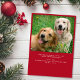 Modern red holiday greeting card featuring a 3 picture photo collage, "We Wish You A Very Merry Christmas" in mix of simple white typography and an elegant white script, and your name and the year. Add a 4th photo and your personalized message and first names on the back.