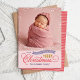 Affordable custom printed holiday photo cards with a simple DIY template for customization. This colourful design features whimsical typography in pink, gold and mauve colours. The message read "Wishing You a Very Merry Christmas". Add your family photo at the top with a subtle snowy overlay border. Use the design tools to edit the fonts and colours. Reverse side has a coordinating stripe pattern or use the space to add more photos and text.