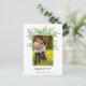Elegant watercolor branches with green leaves behind a family photo on this simple holiday card.